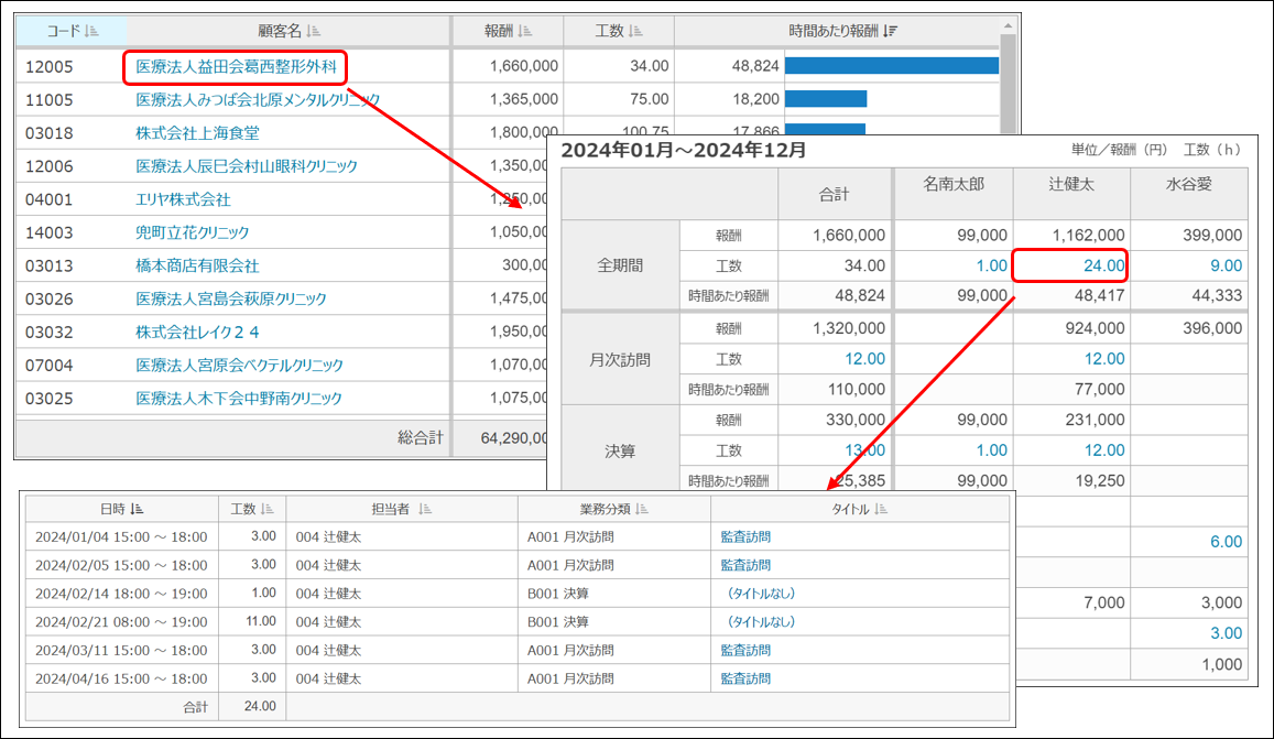 顧客ごとに詳細を確認することで、業務分類別や担当者別に生産性を分析し、問題点を発見することが可能です。