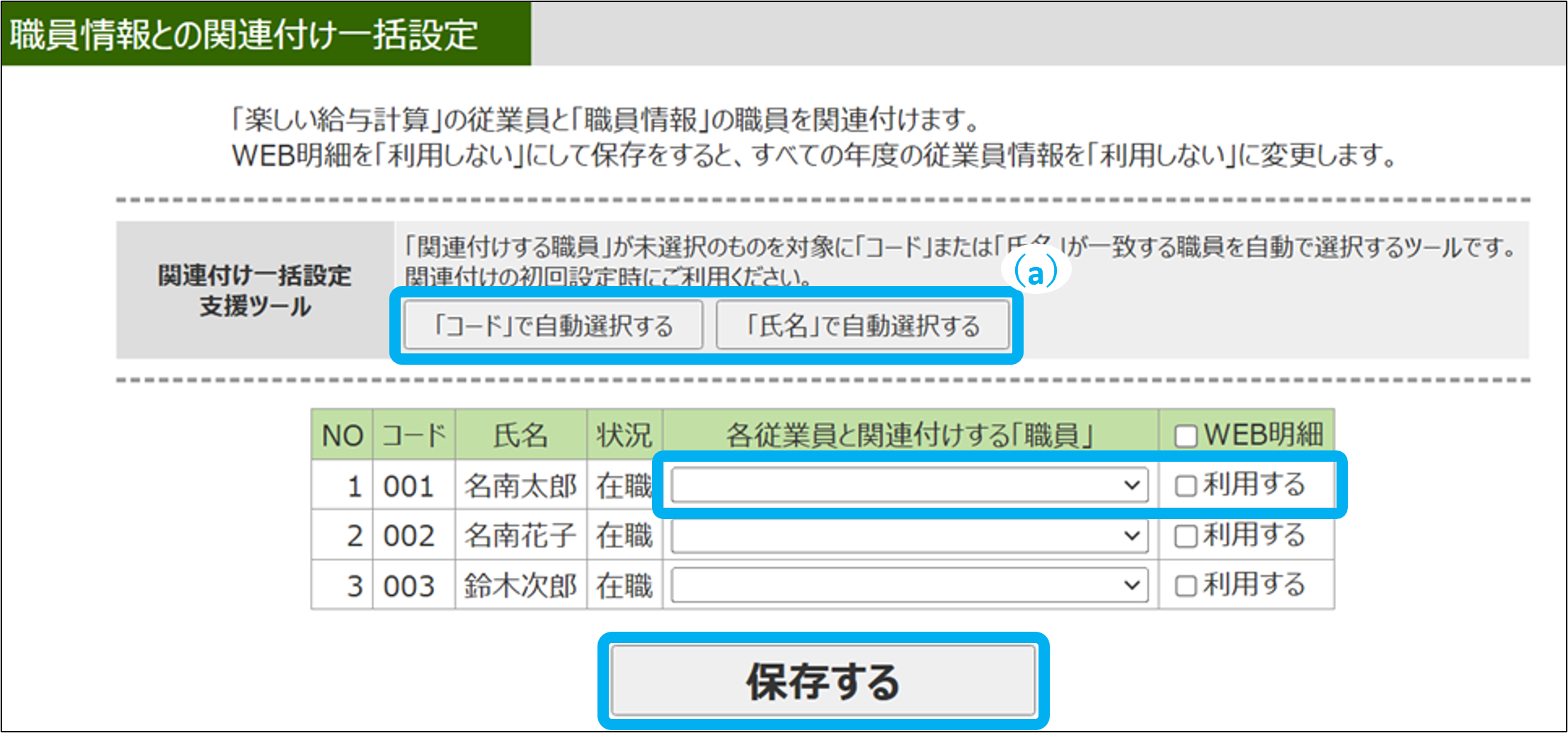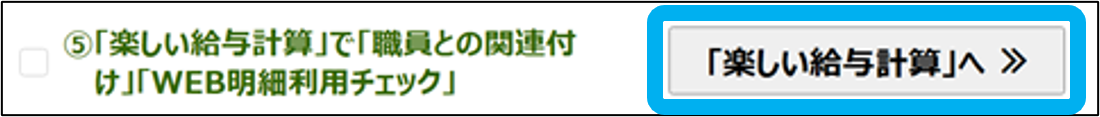 「「楽しい給与計算」で「職員との関連付け」「WEB明細利用チェック」」を行います。