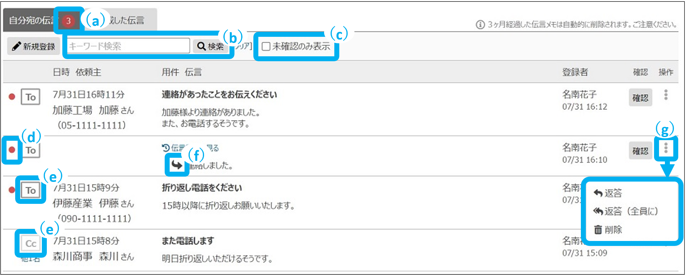 ※初期値は、未確認の伝言メモのみに絞られています。