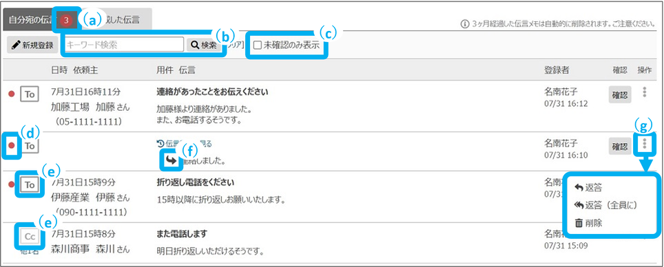 伝言メモを検索できます。