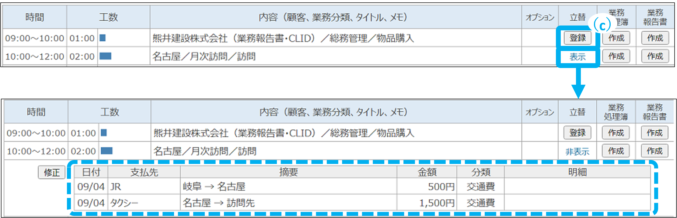 日報参照画面からも立替を登録できます。