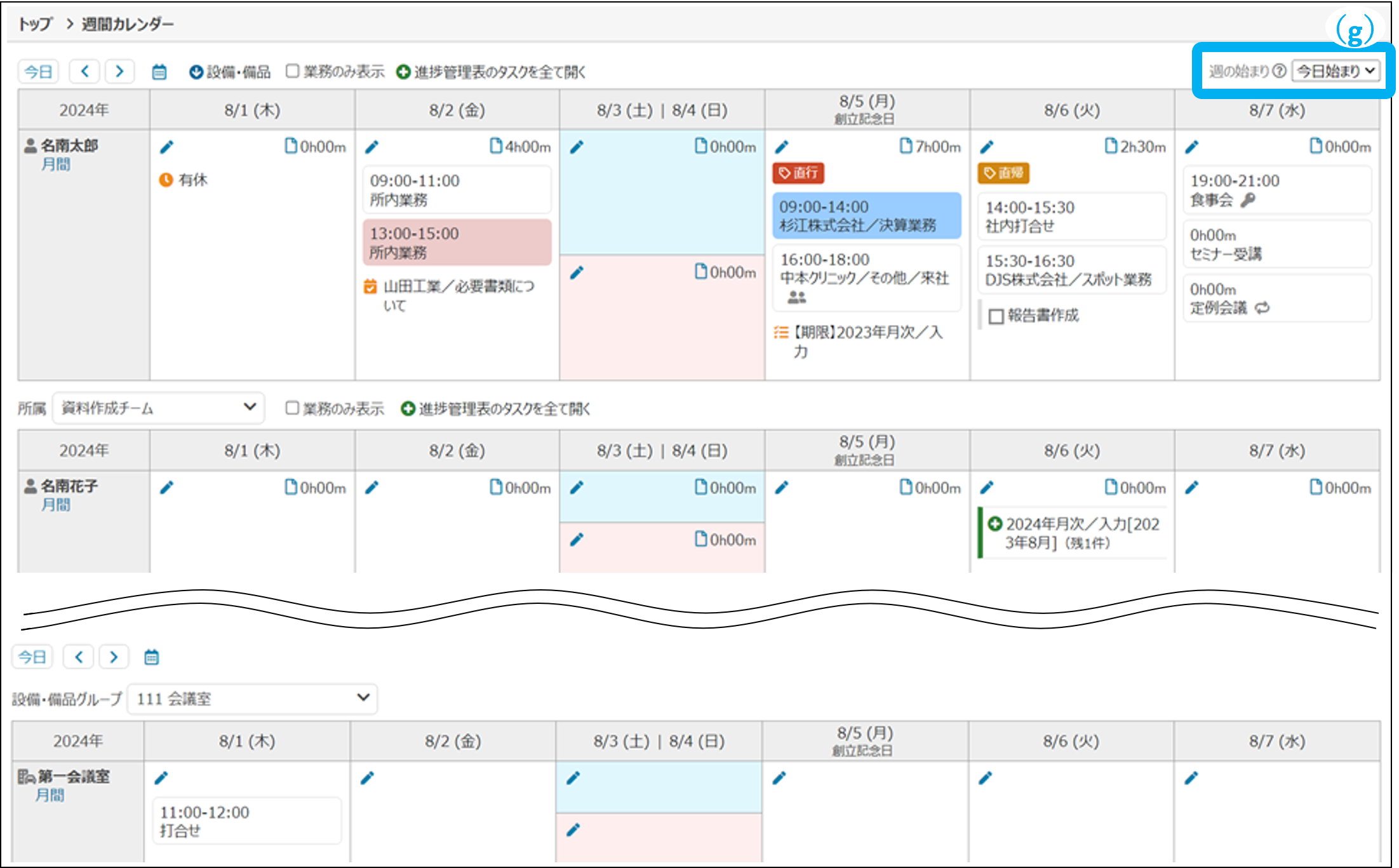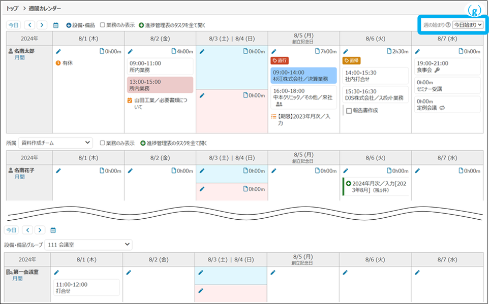 自分、他の職員、設備・備品の、1週間の予定を確認できます。