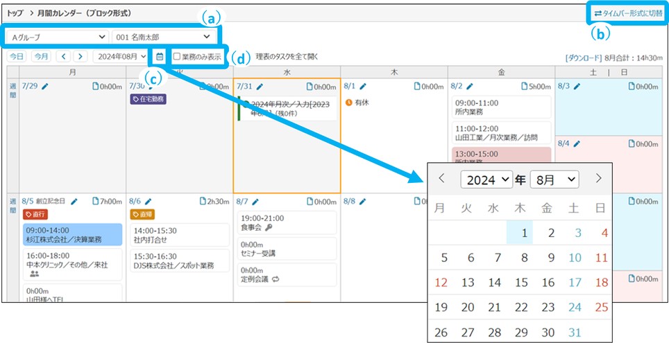 自分、他の職員、設備・備品の、その日の予定を確認できます。