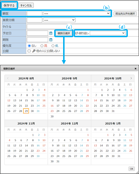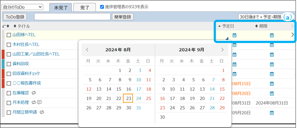 クリックすると、カレンダーが表示され、予定日・期限を登録できます。