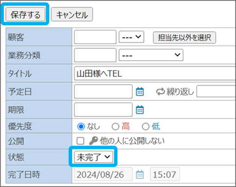 ③状態を「完了」に変更し、「保存する」をクリック