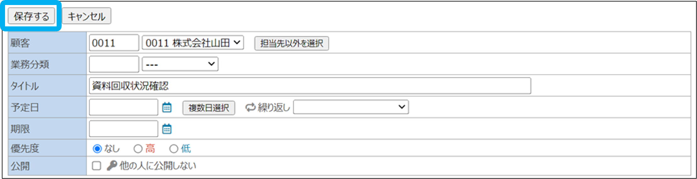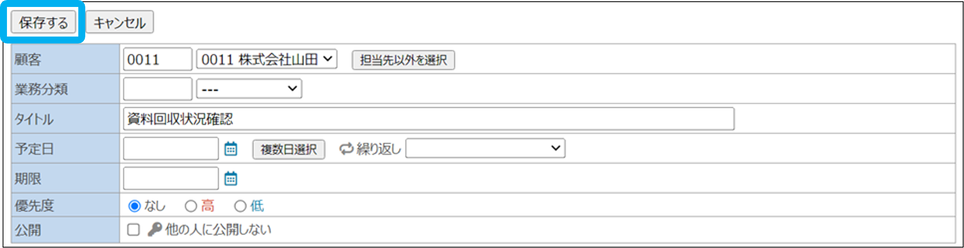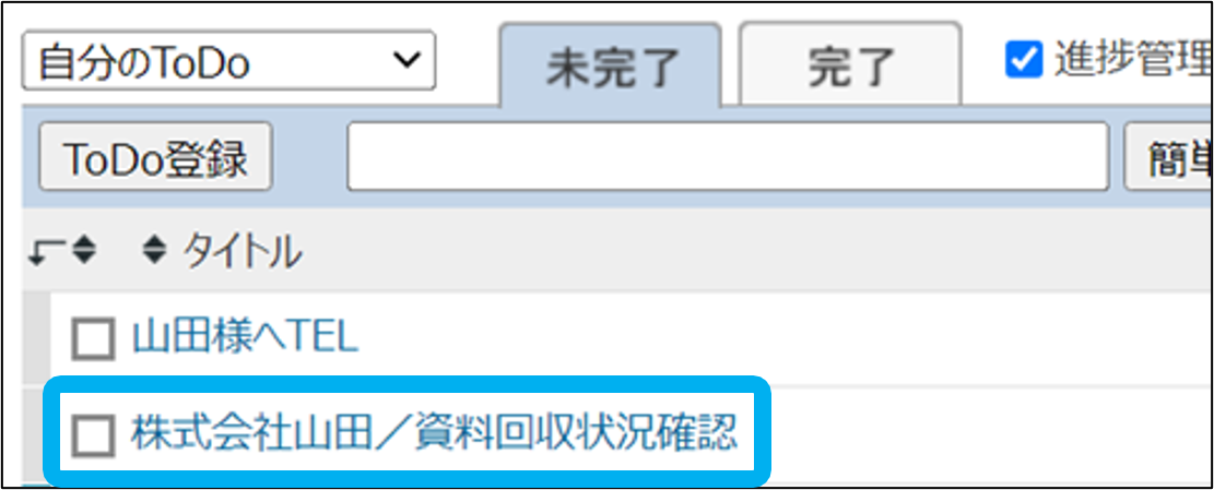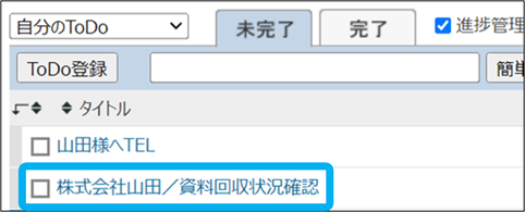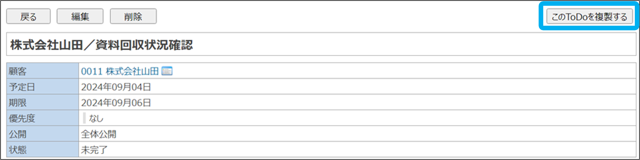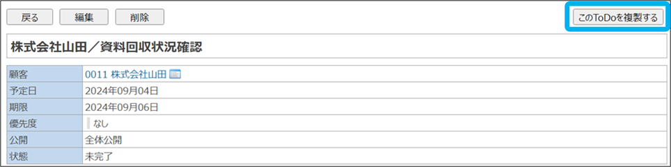 グループウェアの関連マニュアル 利用準備編 活用編 HOME マニュアル グループウェアメニュー グループウェア 活用編 ToDoの複製 目次 活用編 TOP グループウェアマニュアル 活用編 カレンダー カレンダー /画面紹介 業務の登録 業務の修正・複製・削除 業務の移動(ドラッグ&ドロップ) グルーピング業務の修正・解除 ラベルの追加・削除 空き時間検索 ToDoリスト ToDoリスト/画面紹介 ToDoの登録 実施担当者の変更 ToDoの完了 ToDoの複製 ToDoの移動(ドラッグ&ドロップ) 共有ToDoリストの登録・編集・削除 共有ToDoの登録 共有ToDoリストの複製 閲覧・編集・削除の権限一覧 報告書 報告書一覧/画面紹介 業務報告書の登録・修正・削除 日報の提出・修正・削除 日報の承認 日報提出一覧表 業務報告書・日報の確認 業務処理簿 業務処理簿の作成・編集・削除 業務処理簿の印刷・ダウンロード 工数分析 工数分析/画面紹介 生産性分析 損益分析 予実分析 工数グラフ 進捗管理表 進捗管理表/画面紹介 ツールバー・その他の機能 進捗管理表の作成 タスクの完了 管理表の終了とロック・削除 管理表の複製 管理表の表示順変更 管理表の分類 集計情報 対象別表示 顧客情報の編集 資料回収 資料回収/画面紹介 資料回収業務の作成 回収リストの作成・公開 資料回収依頼書の作成 回収状況の完了処理 年度更新(資料回収業務) 資料回収業務の終了・削除 表示順の変更(資料回収業務) ワークフロー ワークフロー/画面紹介 申請書の作成 申請書の承認・決裁・処理 申請書の取り下げ 申請書の削除 申請書の複製 伝言メモ 伝言メモ/画面紹介 伝言メモの作成 伝言メモの確認・返答・削除 個人ツール マイグループ設定 立替精算書 その他 ホーム設定 ToDoの複製 ToDoを複製できます。 ①「ToDo」をクリック ②タイトルをクリック ③「このToDoを複製する」をクリック ④必要な項目を変更し、「保存する」をクリック ToDoの複製が完了しました。 このページを印刷する