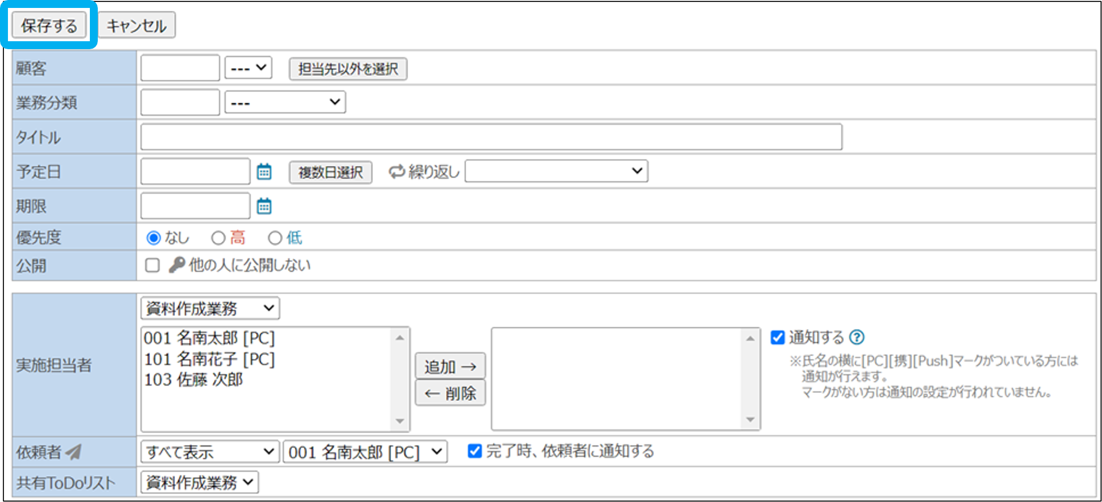 ※ToDoリスト画面からの実施担当者の変更方法は、実施担当者の変更をご覧ください。