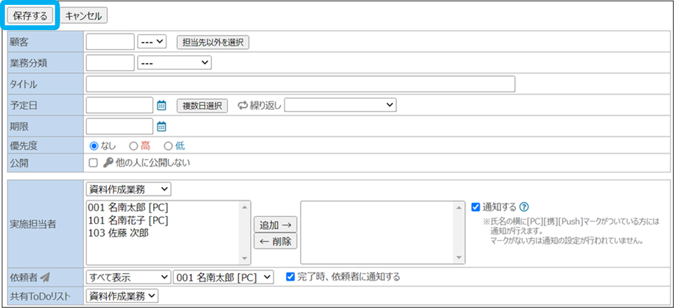 各項目の詳細は、ToDoの登録をご覧ください。