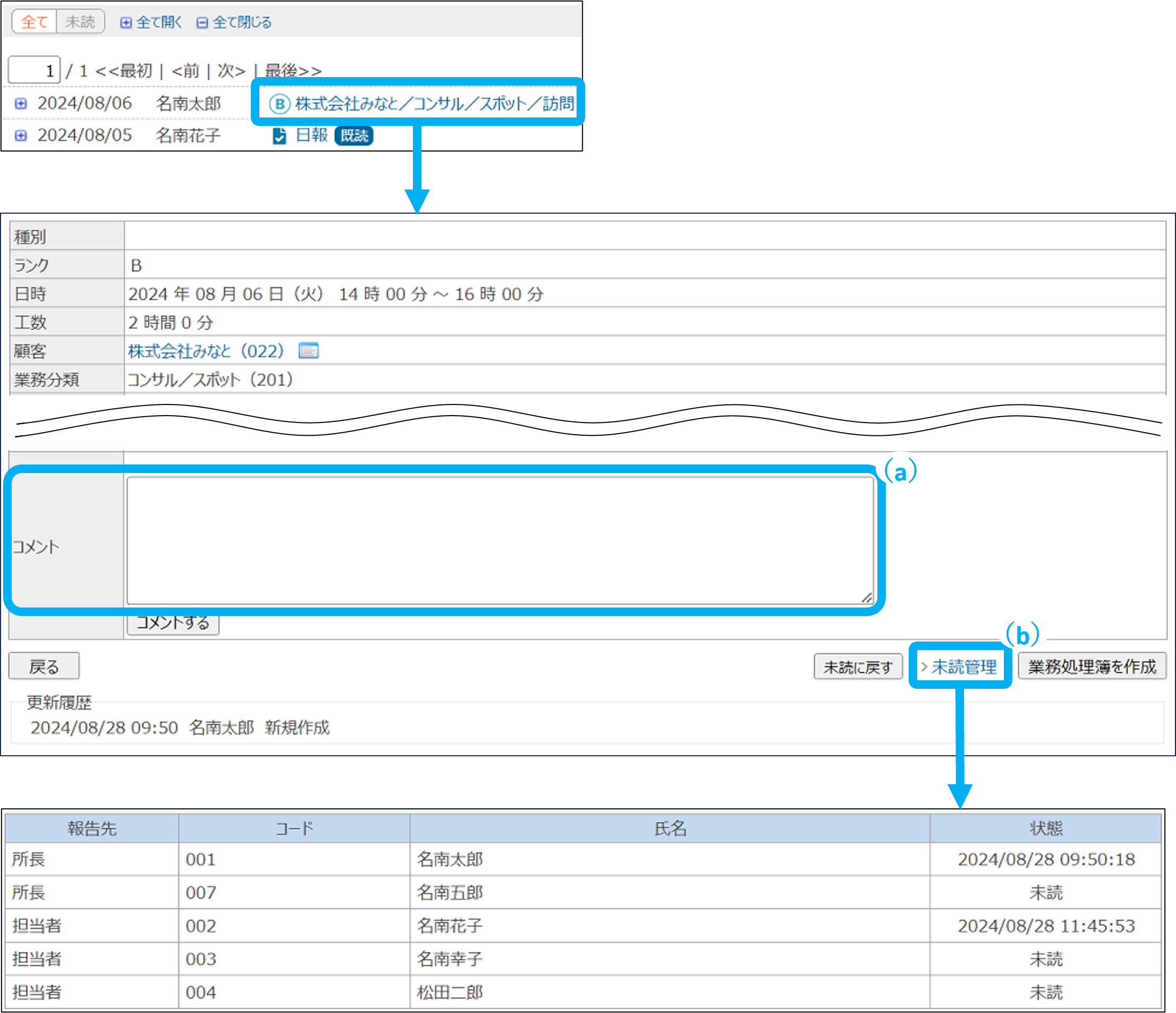 コメントをすると、報告先となっている職員と、作成者の報告書一覧に「未読」が表示されます。