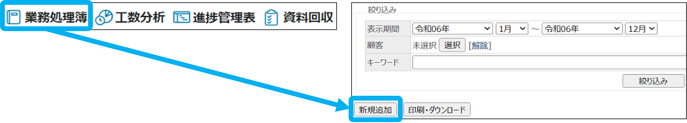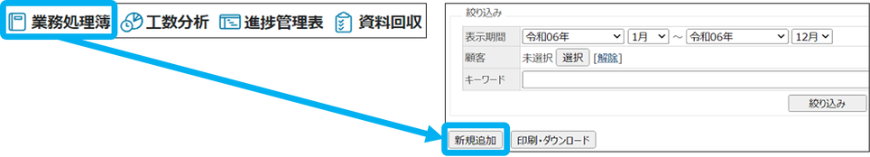 ①「業務処理簿」をクリックし、「新規追加」をクリック