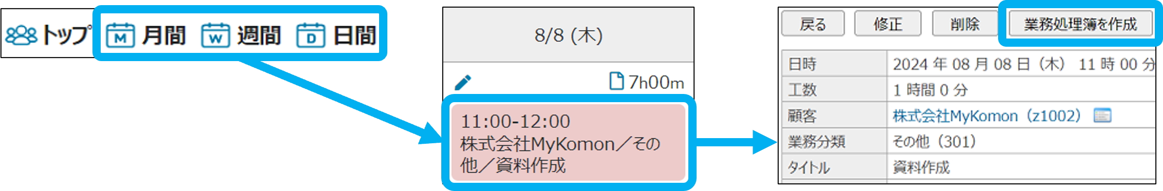 ※業務参照画面または、提出済みの日報から作成する場合、顧客情報・日時が業務処理簿にコピーされます。