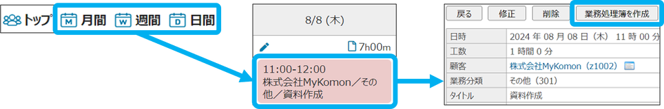 ①カレンダーをクリックし、業務処理簿を作成する業務をクリックし、「業務処理簿を作成」をクリック