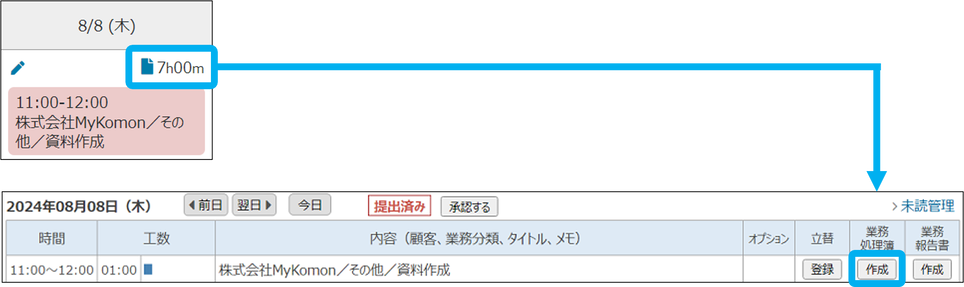 ①合計工数をクリックし、業務処理簿の「作成」をクリック