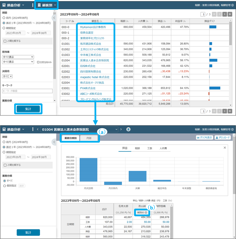 ③「顧客別」もしくは「担当者別」を選択し、 「集計」をクリック