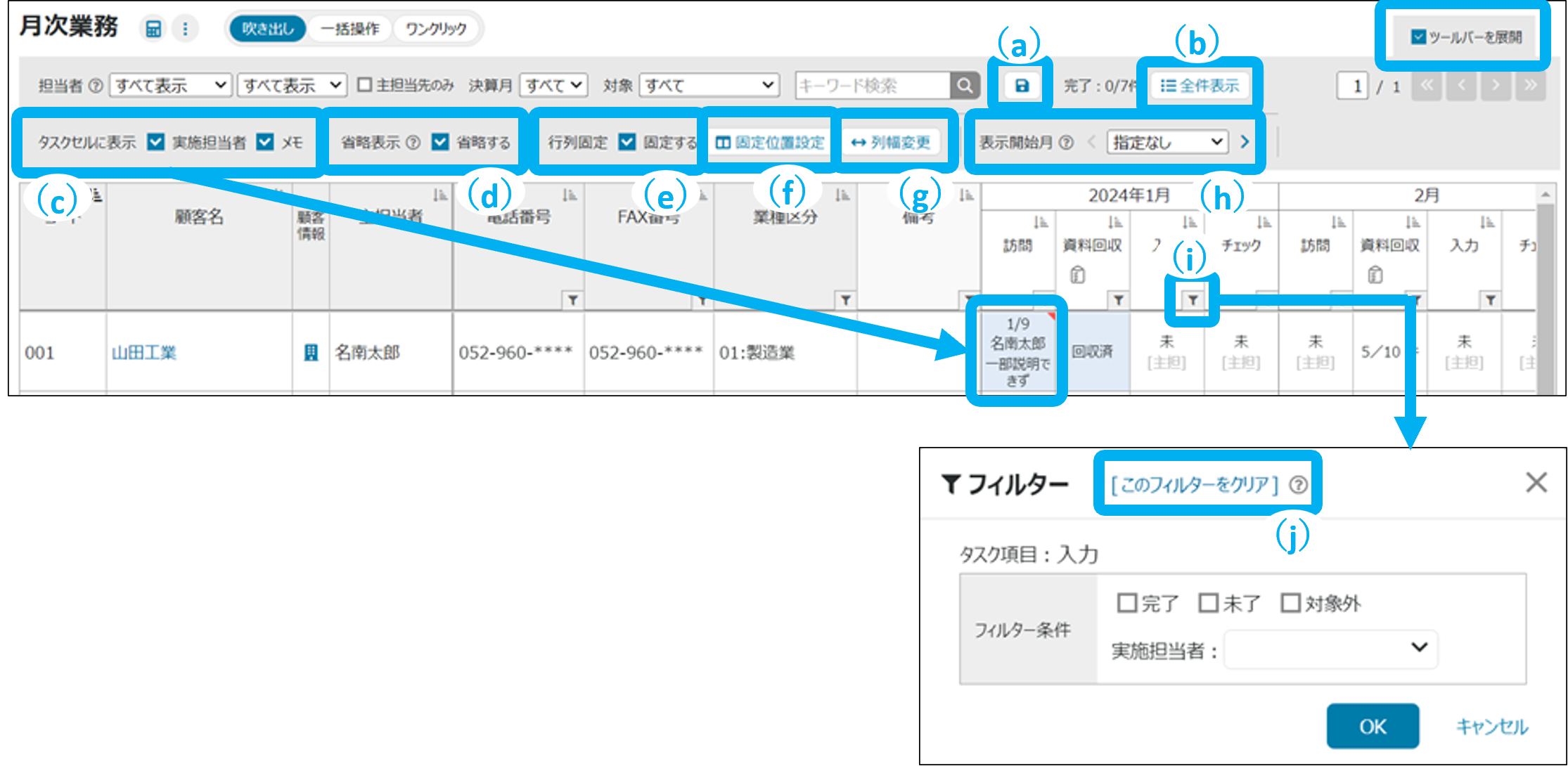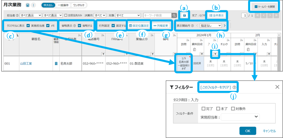 職員IDごとに、ツールバーの絞り込み条件(※1)、表上のフィルター条件、ソート順を保存できます。