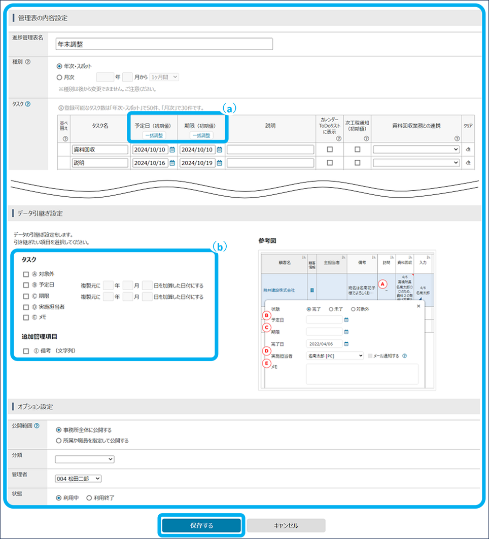 種別が「年次・スポット」の場合、予定日と期限を一括で調整できます。