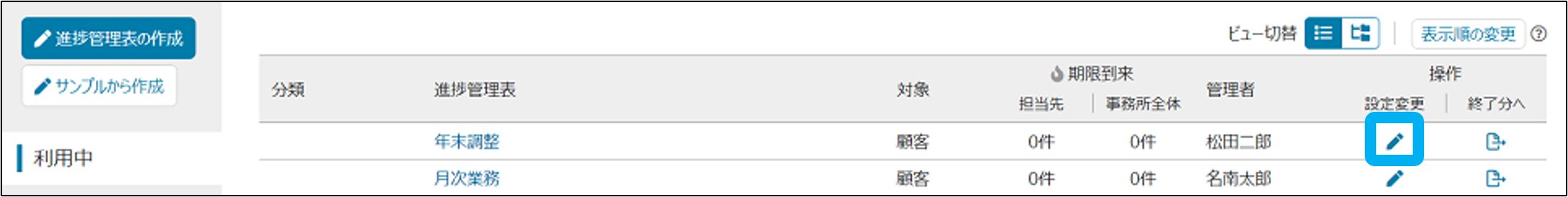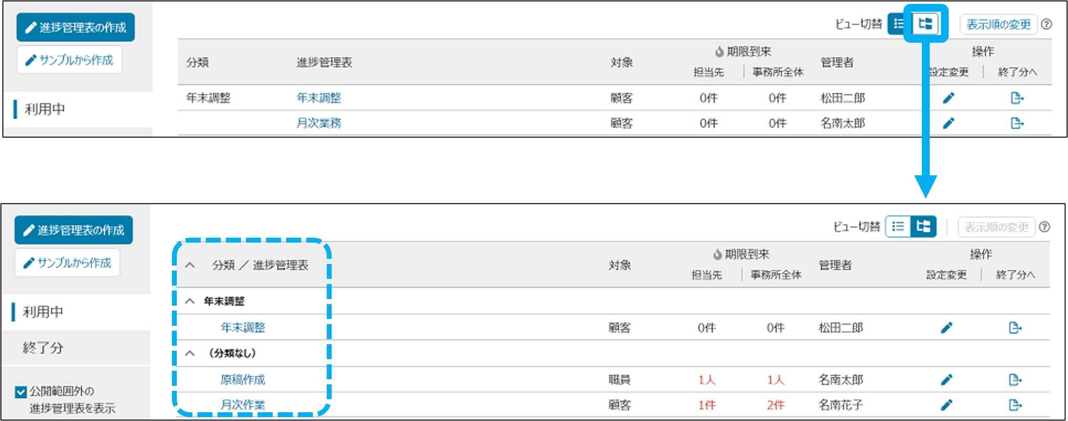 進捗管理表に分類を設定し、分類ごとに表示できます。
