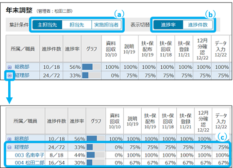 進捗管理表の進捗件数や進捗率を、所属別・職員別に確認できます。