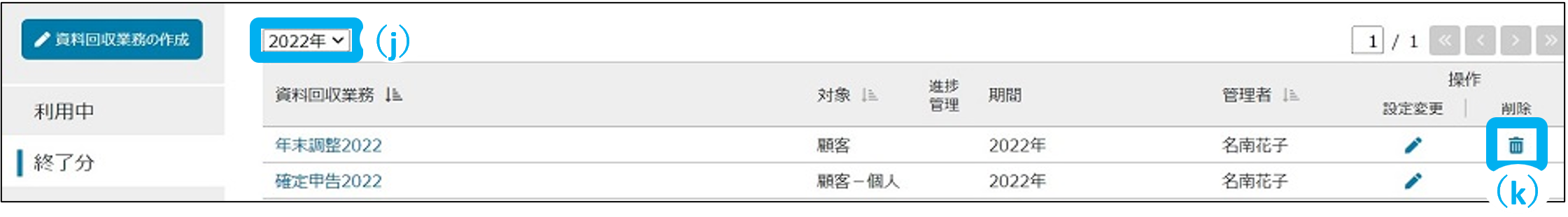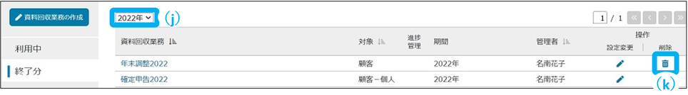 終了分の資料回収業務を年度ごとに表示できます。