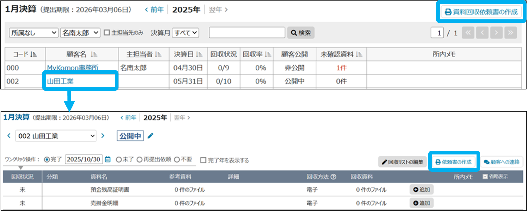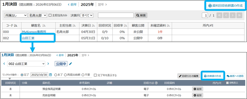 もしくは、顧客名をクリックし、回収状況から「依頼書の作成」をクリック