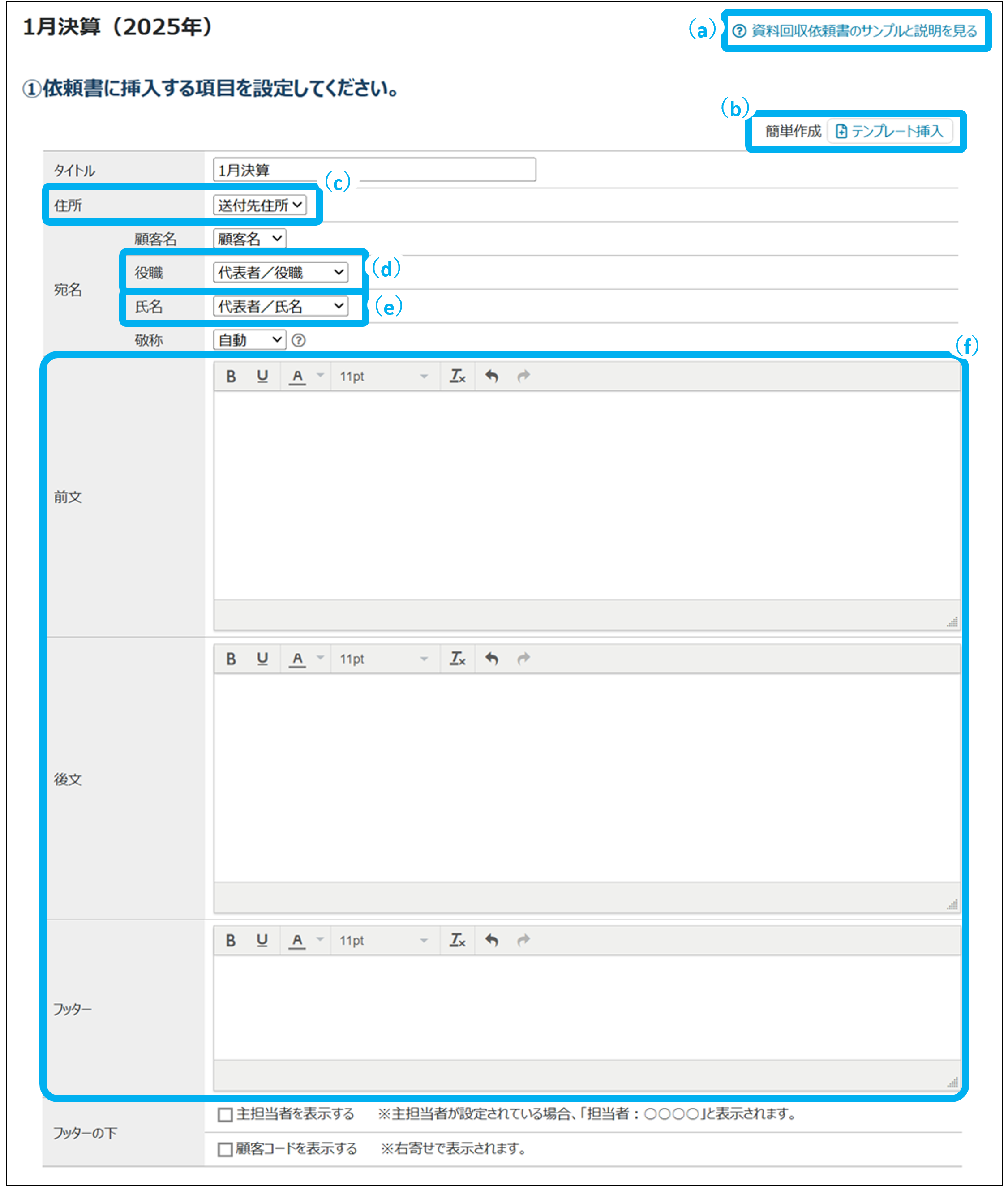 挿入する項目が、資料回収依頼書に表示される箇所を確認できます。