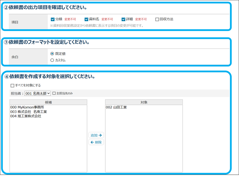 作成した回収リストを元に、宛先や住所、必要な書類一覧など、必要な項目が記載された回収依頼書を手間なく作成できます。