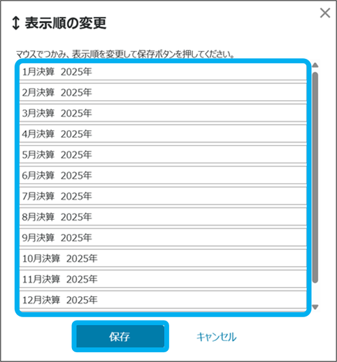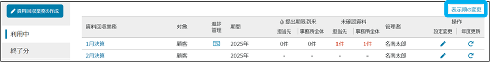 グループウェアの関連マニュアル 利用準備編 活用編 HOME マニュアル グループウェアメニュー グループウェア 活用編 表示順の変更(資料回収業務) 目次 活用編 TOP グループウェアマニュアル 活用編 カレンダー カレンダー /画面紹介 業務の登録 業務の修正・複製・削除 業務の移動(ドラッグ&ドロップ) グルーピング業務の修正・解除 ラベルの追加・削除 空き時間検索 ToDoリスト ToDoリスト/画面紹介 ToDoの登録 実施担当者の変更 ToDoの完了 ToDoの複製 ToDoの移動(ドラッグ&ドロップ) 共有ToDoリストの登録・編集・削除 共有ToDoの登録 共有ToDoリストの複製 閲覧・編集・削除の権限一覧 報告書 報告書一覧/画面紹介 業務報告書の登録・修正・削除 日報の提出・修正・削除 日報の承認 日報提出一覧表 業務報告書・日報の確認 業務処理簿 業務処理簿の作成・編集・削除 業務処理簿の印刷・ダウンロード 工数分析 工数分析/画面紹介 生産性分析 損益分析 予実分析 工数グラフ 進捗管理表 進捗管理表/画面紹介 ツールバー・その他の機能 進捗管理表の作成 タスクの完了 管理表の終了とロック・削除 管理表の複製 管理表の表示順変更 管理表の分類 集計情報 対象別表示 顧客情報の編集 資料回収 資料回収/画面紹介 資料回収業務の作成 回収リストの作成・公開 資料回収依頼書の作成 回収状況の完了処理 年度更新(資料回収業務) 資料回収業務の終了・削除 表示順の変更(資料回収業務) ワークフロー ワークフロー/画面紹介 申請書の作成 申請書の承認・決裁・処理 申請書の取り下げ 申請書の削除 申請書の複製 伝言メモ 伝言メモ/画面紹介 伝言メモの作成 伝言メモの確認・返答・削除 個人ツール マイグループ設定 立替精算書 その他 ホーム設定 表示順の変更(資料回収業務) 資料回収業務の表示順を変更できます。 ①「表示順の変更」をクリック ②ドラッグ&ドロップで表示順を変更し、「保存」をクリック 表示順の変更が完了しました。 このページを印刷する