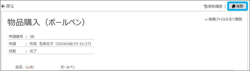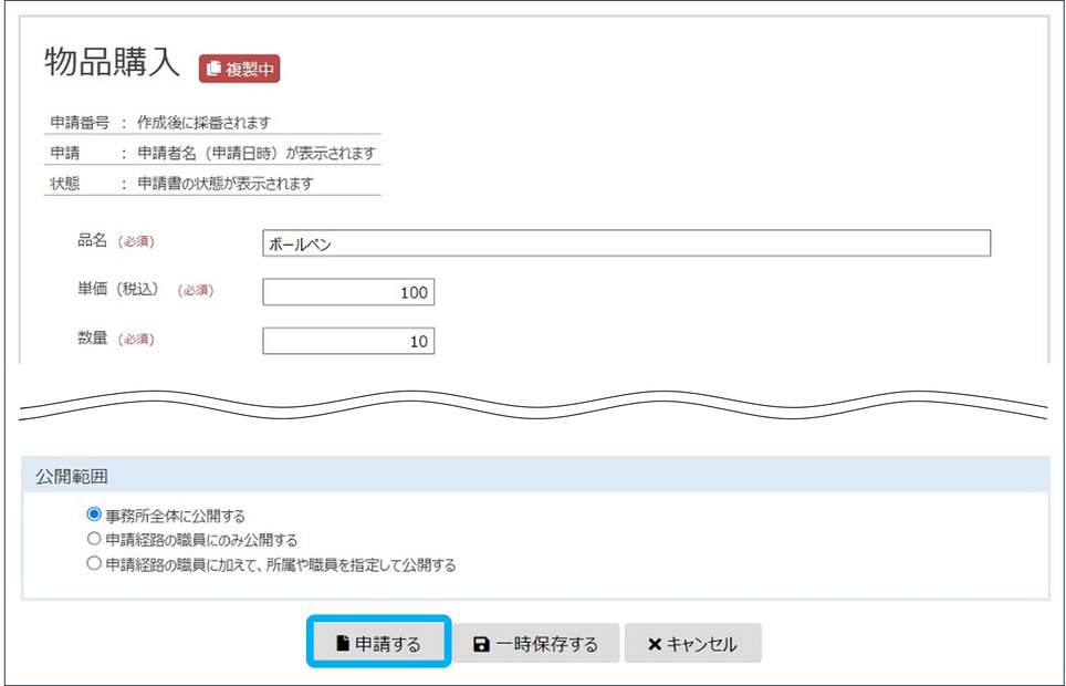 ※複製対象は、入力可能なタイミングが「申請時」を選択している項目のみです。ただし、添付ファイルは複製されません。