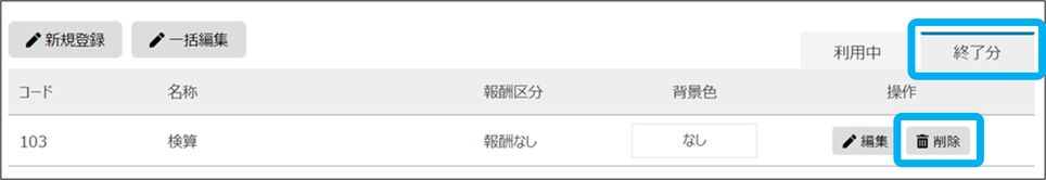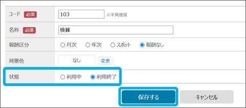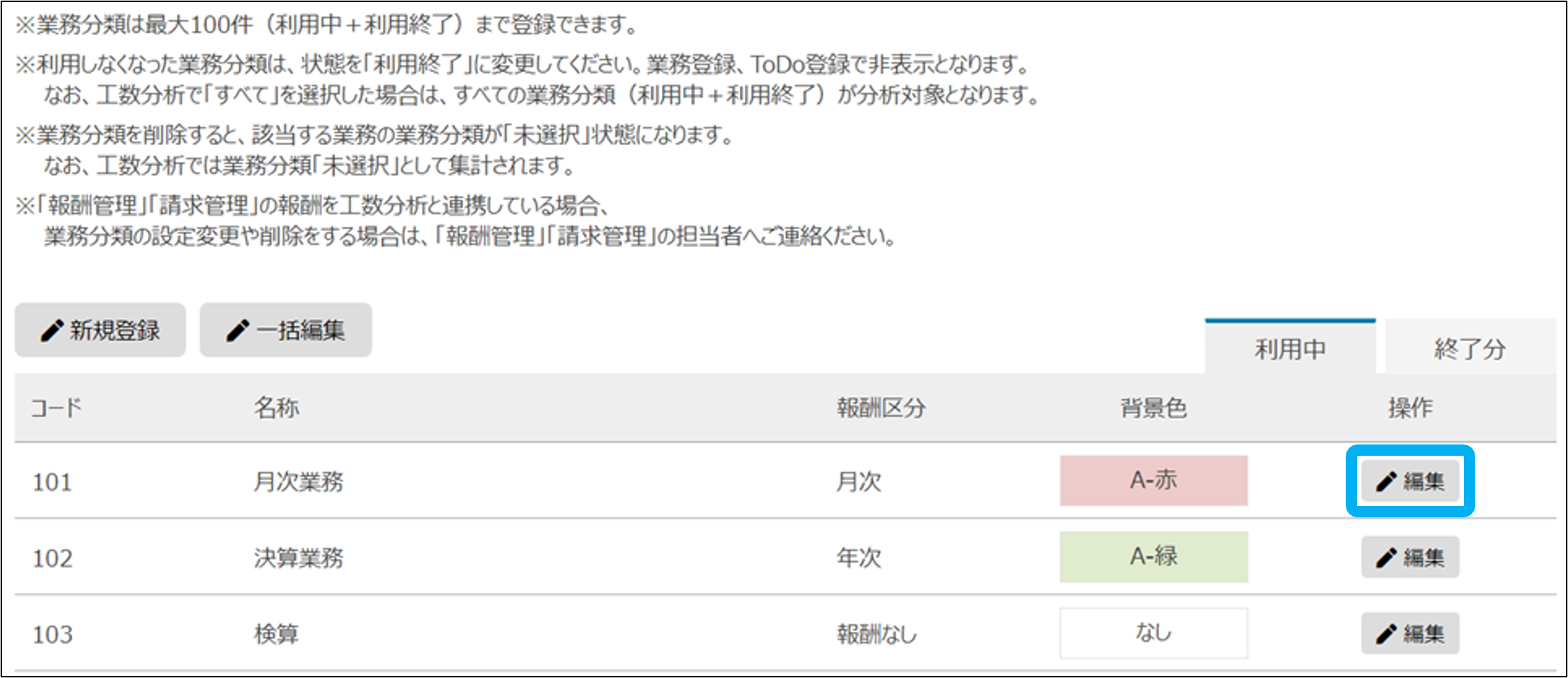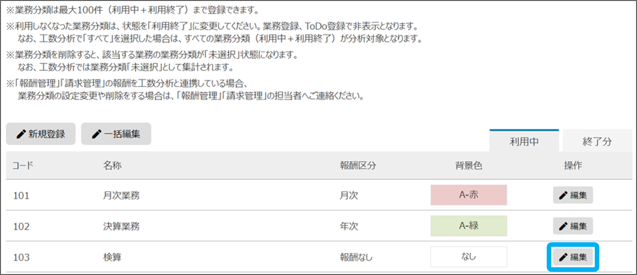 過去に利用していて、今後利用しなくなる業務分類は、削除せずに状態を「利用終了」に変更することをおすすめします。