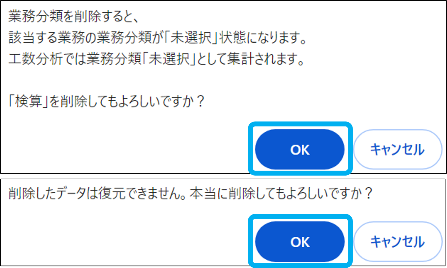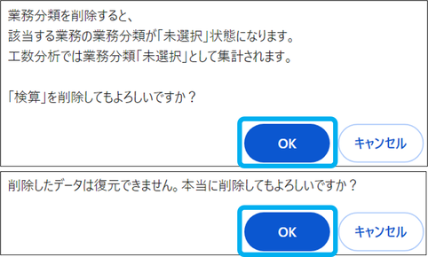 業務分類を削除すると、該当する業務の業務分類が「未選択」状態になります。