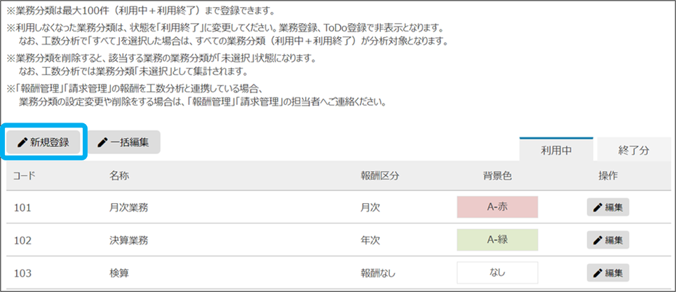 利用しなくなった業務分類は、状態を「利用終了」にしてください。