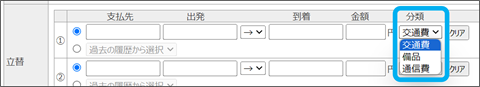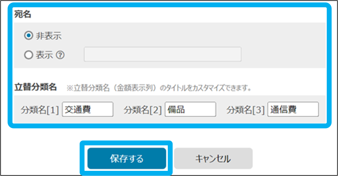 ※立替分類名の初期値は、分類名[1]:金額①、分類名[2]:金額②、分類名[3]:金額③となっています。