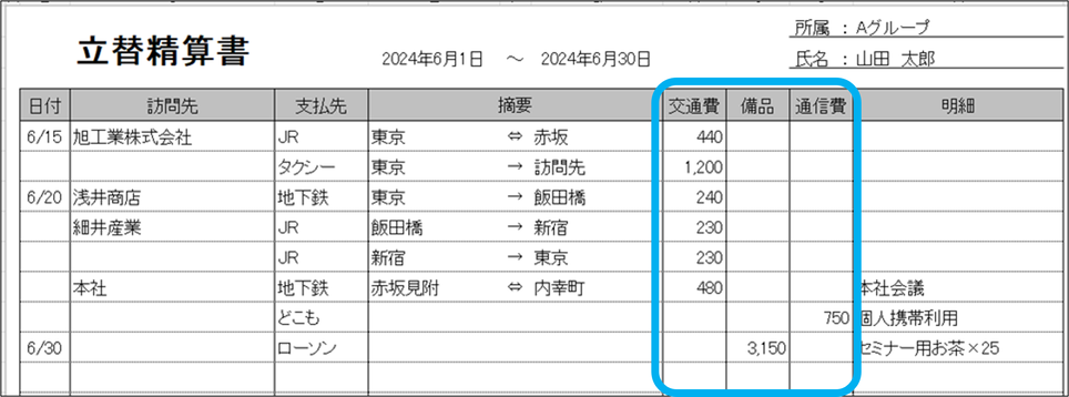 ダウンロードした立替精算書に、分類ごとに金額が表示されます。