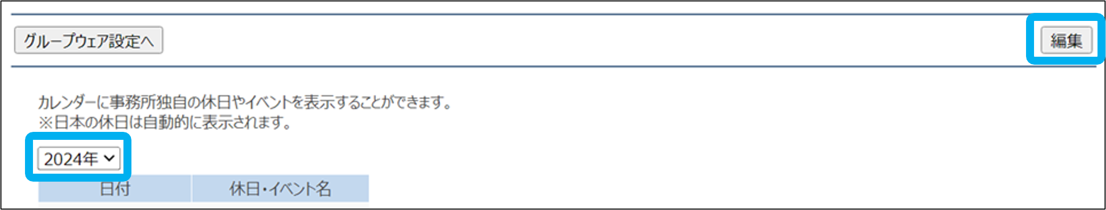 ②イベントを表示したい年を選択し、「編集」をクリック