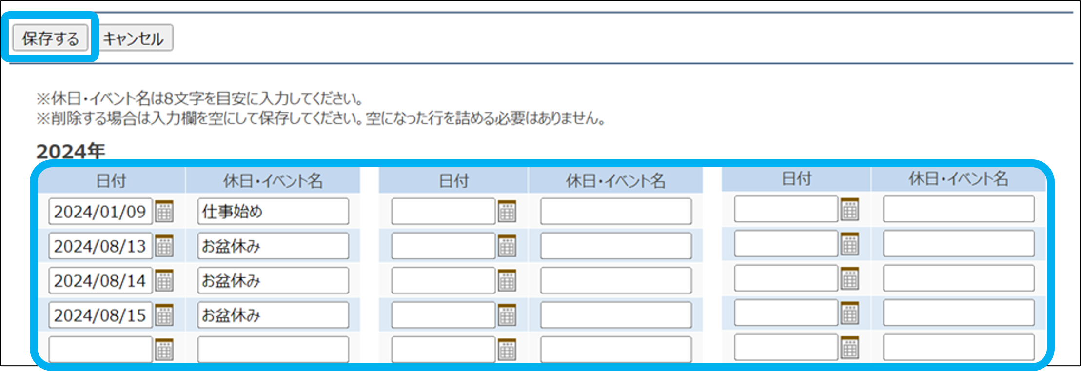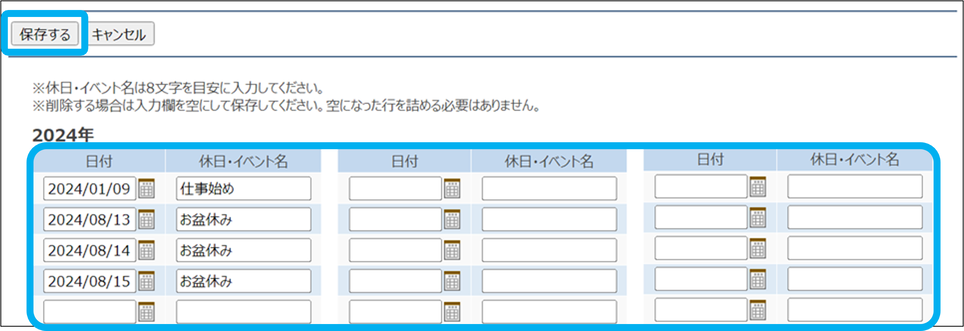 ③日付、休日・イベント名を入力し、「保存する」をクリック