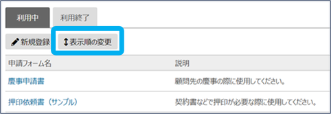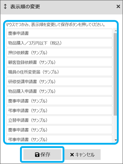 グループウェアの関連マニュアル 利用準備編 活用編 HOME マニュアル グループウェアメニュー グループウェア 利用準備編 申請フォーム(表示順の変更) 目次 利用準備編 TOP グループウェアマニュアル 利用準備編 基本 権限設定 共通マスタ設定 業務分類(登録・修正・削除) 業務分類(一括編集) 立替 通知 グループウェアトップ メッセージ設定 カレンダー 休日・イベント ラベル設定 設備・備品グループ(登録・修正・削除) 設備・備品(登録・修正・削除) 業務報告書 報告書種別 公開範囲 業務報告書・日報 報告先 業務処理簿 業務処理簿/入力アシスト候補 工数分析 報酬設定 業務分類別報酬/一括登録 業務分類別報酬/年度更新 予定工数/一括登録 時間単価 進捗管理表 進捗管理分類 資料回収 回収リストテンプレート 依頼書テンプレート ワークフロー 申請フォーム(新規登録) 申請フォーム(修正・削除) 申請フォーム(表示順の変更) 申請フォーム(表示順の変更) 申請フォームの表示順を変更できます。 ①「申請フォーム」をクリック ②「表示順の変更」をクリック ③ドラッグ&ドロップで表示順を変更し、「保存」をクリック 表示順の変更が完了しました。 このページを印刷する