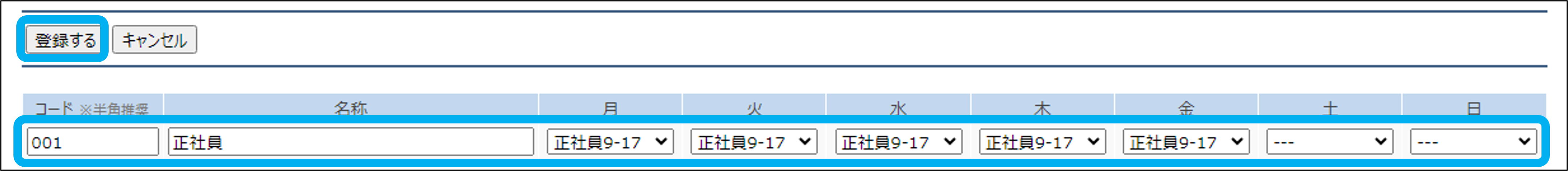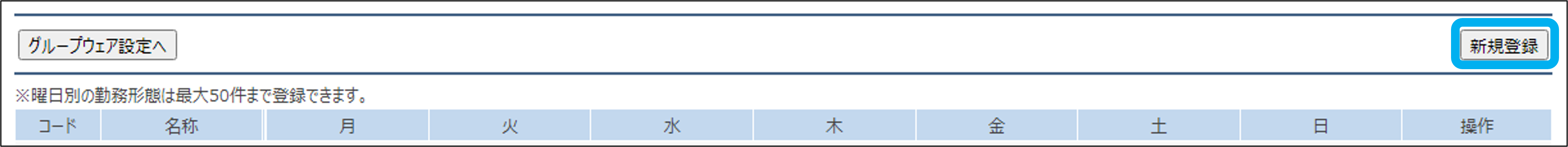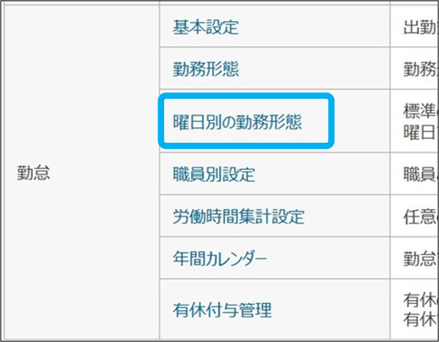 勤怠(事務所向け)の関連マニュアル 利用準備編 活用編 HOME マニュアル グループウェアメニュー 勤怠(事務所向け) 利用準備編 曜日別の勤務形態 目次 利用準備編 TOP 勤怠(事務所向け)マニュアル 利用準備編 グループウェア設定 基本設定 勤務形態 曜日別の勤務形態 職員別設定 労働時間集計設定 年間カレンダー 有休付与管理 有休付与管理(有休付与) 有休付与管理の仕様 曜日別の勤務形態 曜日ごとで勤務時間が異なる場合に設定します。 ①「曜日別の勤務形態」をクリック ②「新規登録」をクリック ③曜日ごとに勤務形態を選択し、「登録する」をクリック 曜日別の勤務形態の登録が完了しました。 このページを印刷する 勤怠(事務所向け)のよくあるご質問 「※必要な申請及び承認がないため、提出できません。」と表示され、出勤簿が提出・承認できません。 シフトに対応していますか? 直行・直帰や出張、在宅等の申請を追加したり、段階承認に変更することはできますか? 出勤簿の承認はどの権限で行うことができますか? 代休や振替休日はどのように入力しますか? 出勤簿の提出はどのように行いますか? 「付与された有休の「1日の時間(時間単位用)」に誤りがあります」というメッセージが出ます。 出勤打刻や退勤打刻は何度でもクリックできますか? 休憩時間を0分にすることはできますか? どこ(場所・端末)で打刻したのか把握できますか?