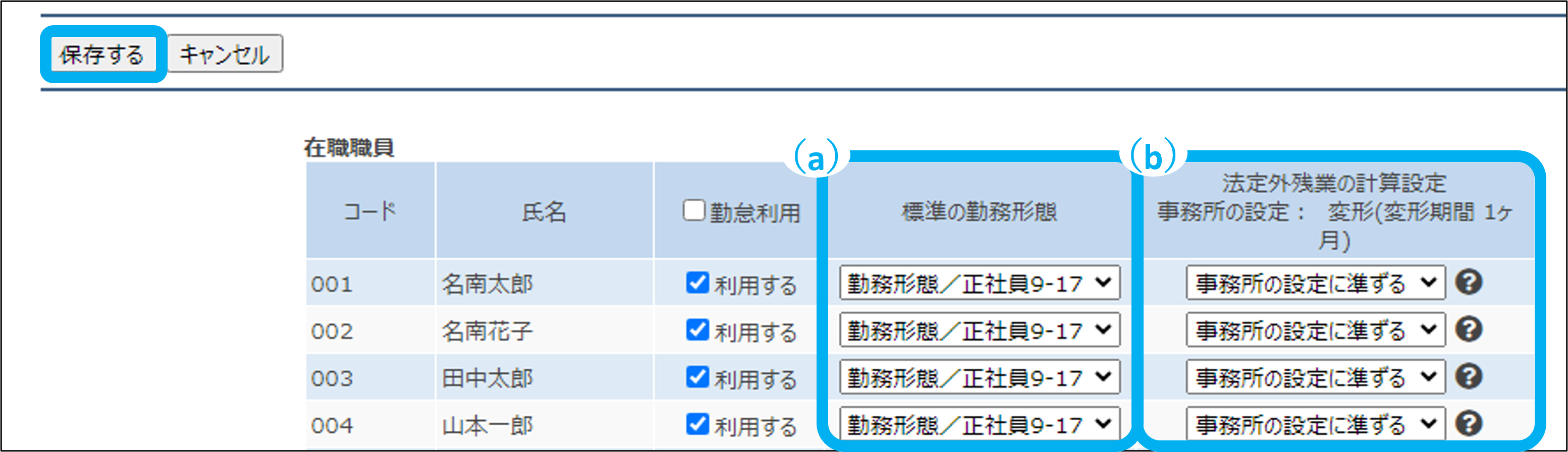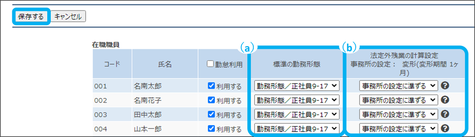 職員ごとに、勤怠の利用と勤務形態を設定します。