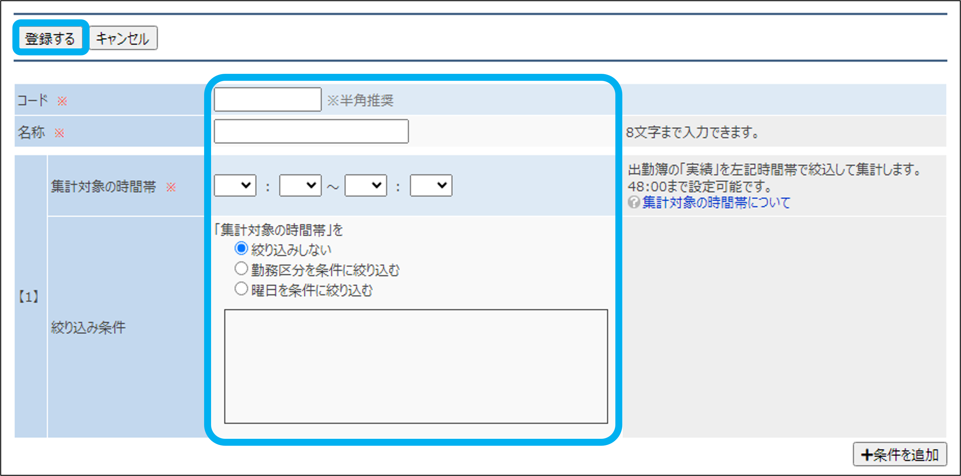 任意の条件(時間帯、勤務区分、曜日)で、労働時間を集計することができます。