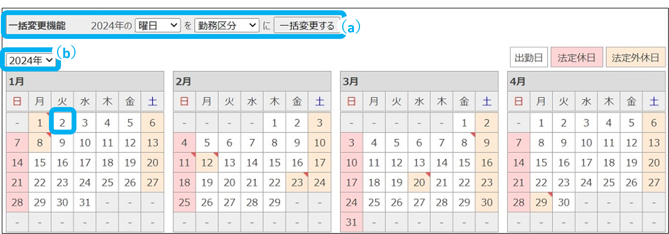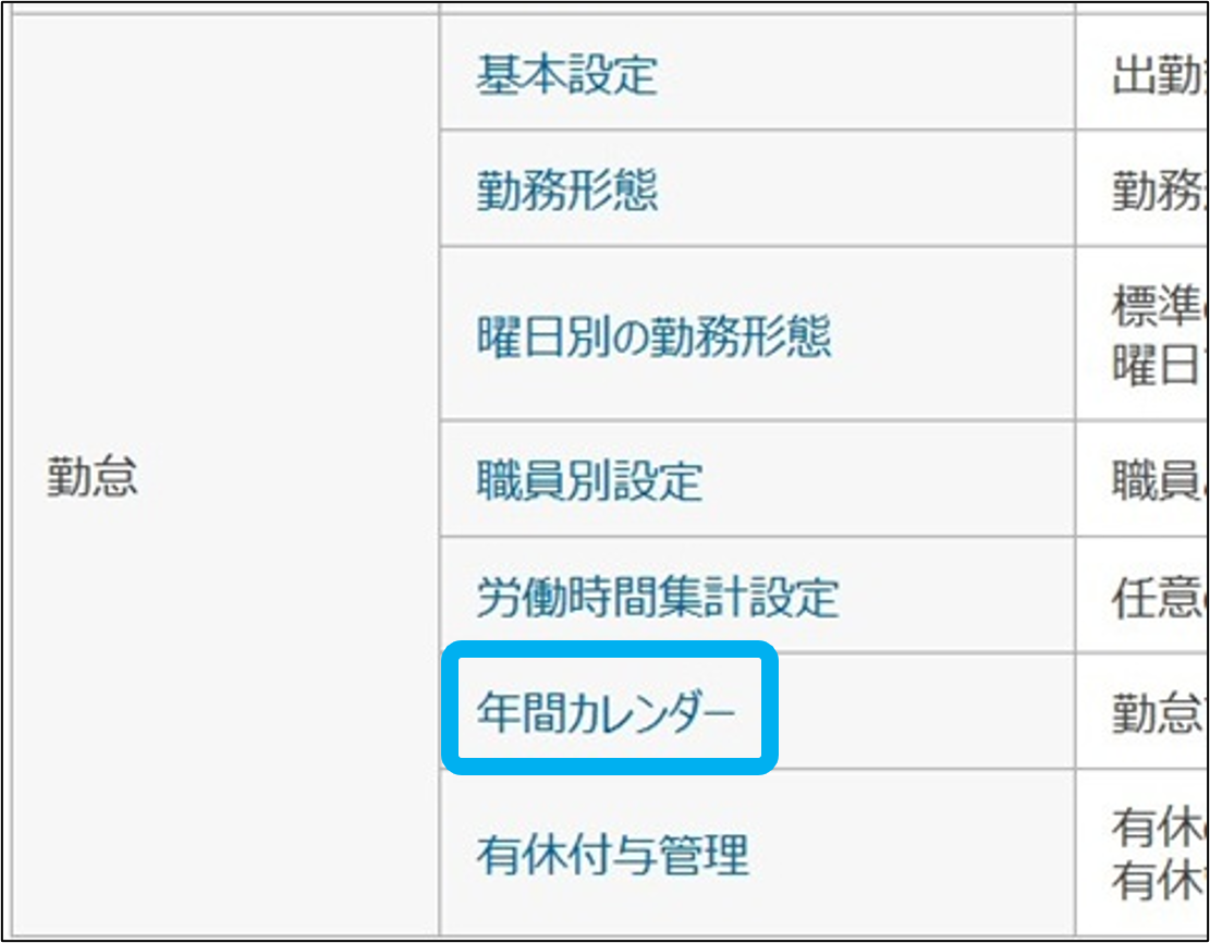 勤怠管理で利用する、1年間の勤務区分(出勤日、法定休日、法定外休日)を設定します。