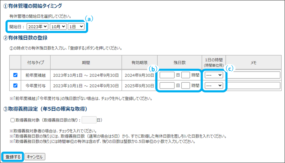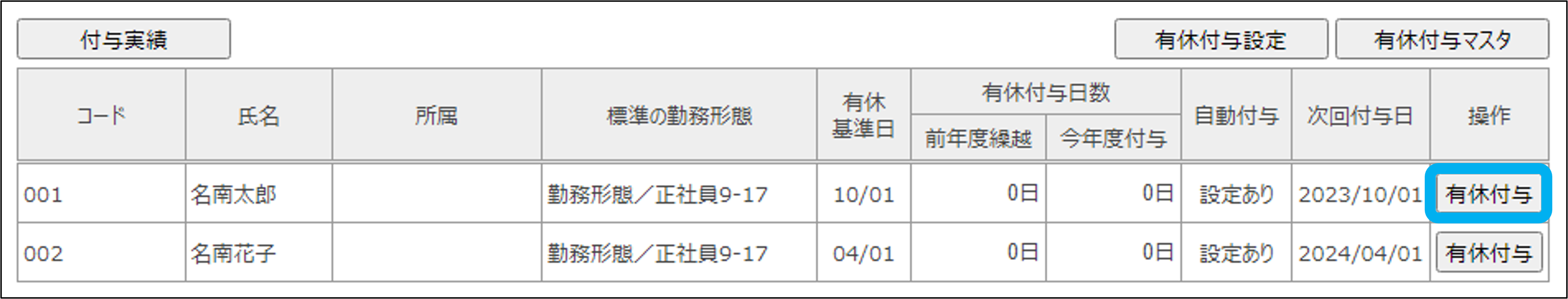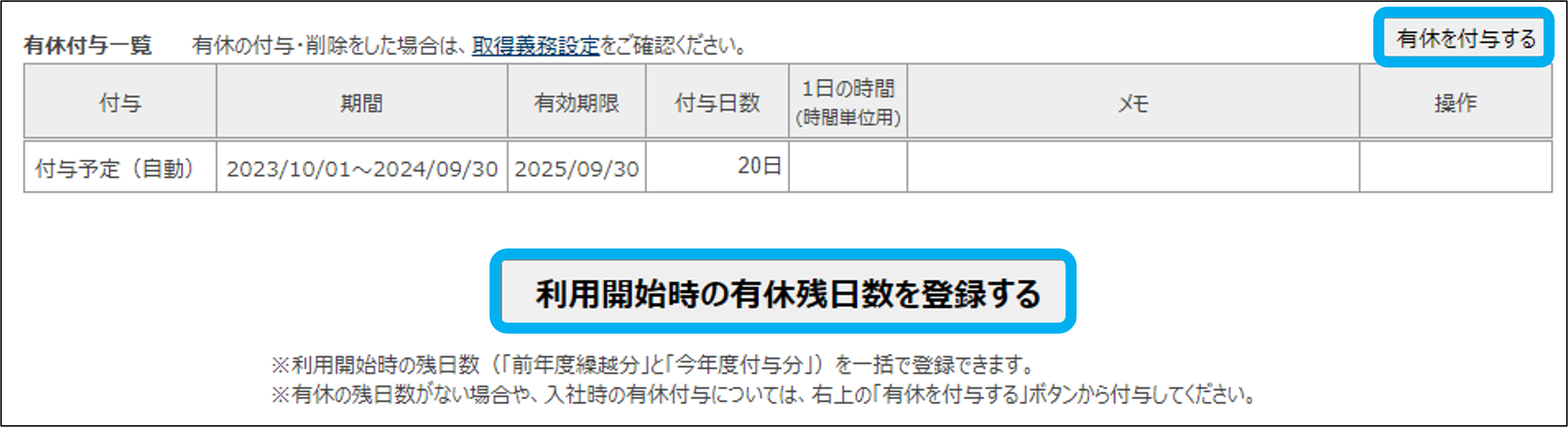 ※入社時などの有休付与については、「有休を付与する」から手動で登録してください。