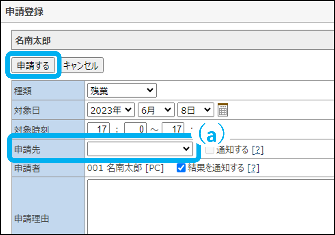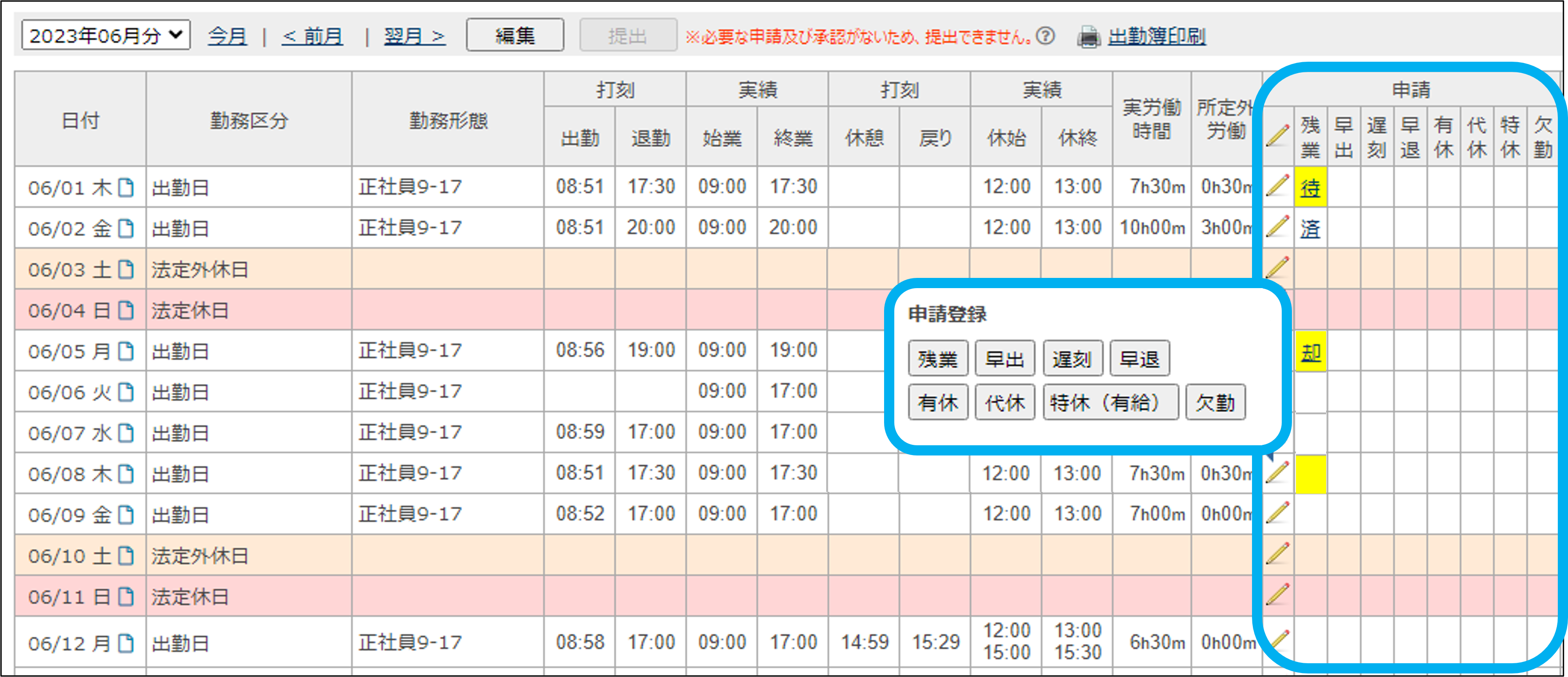 ③申請欄のえんぴつマークまたは、黄色のマスをクリック