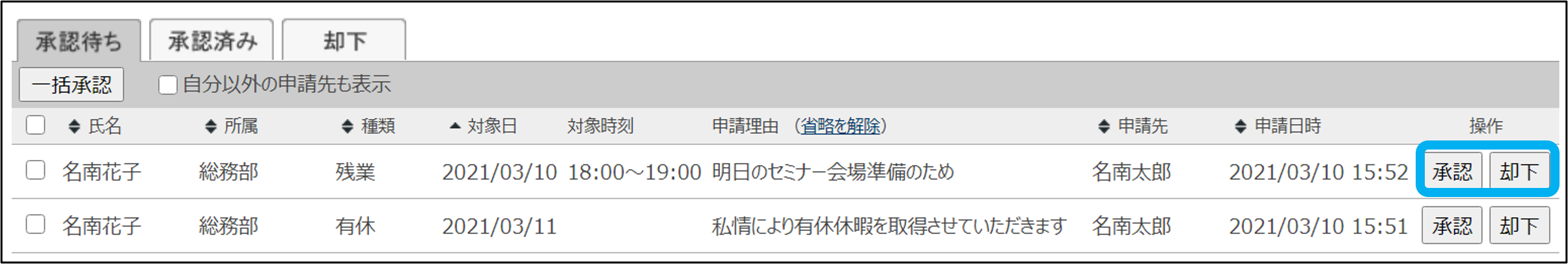 ②申請の「承認」または「却下」をクリック