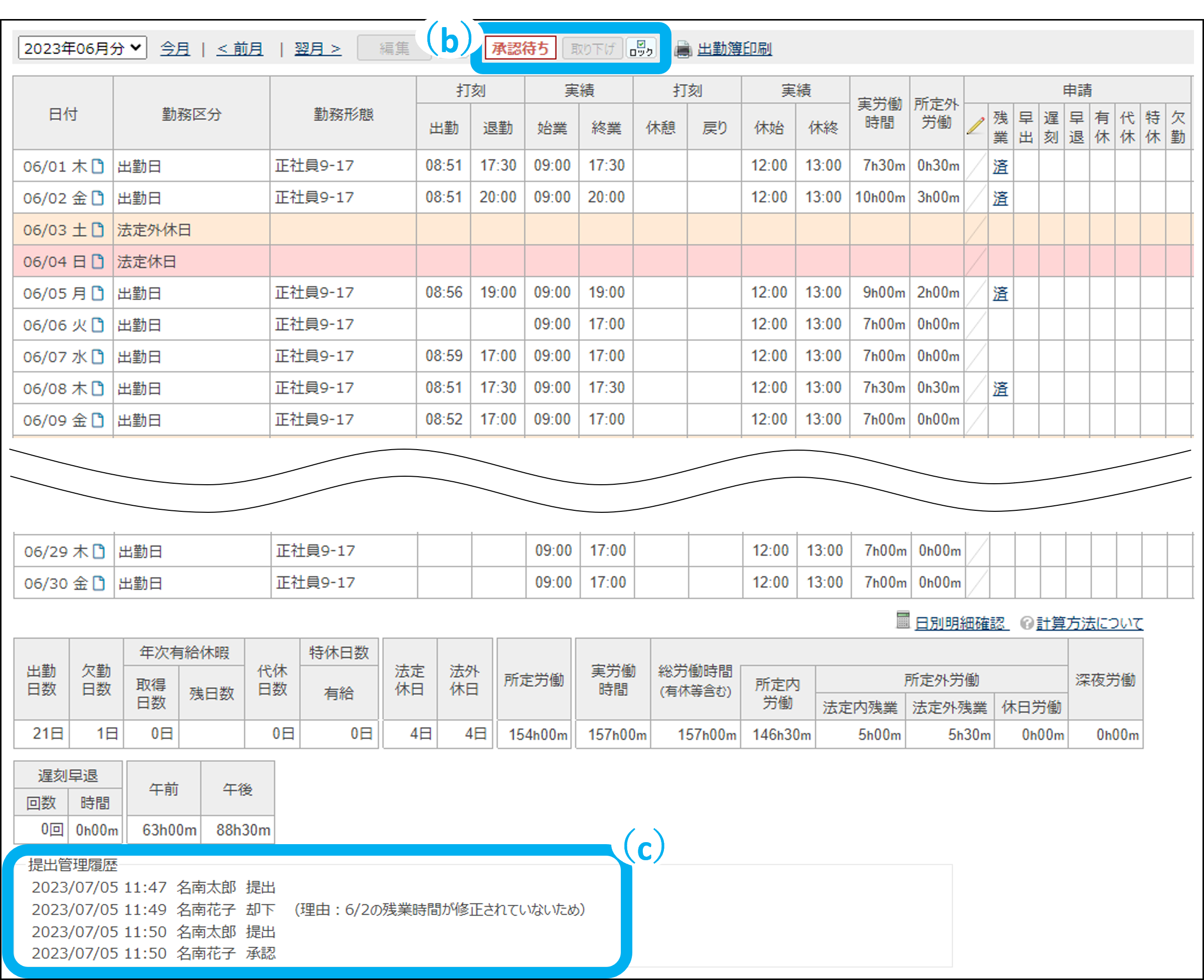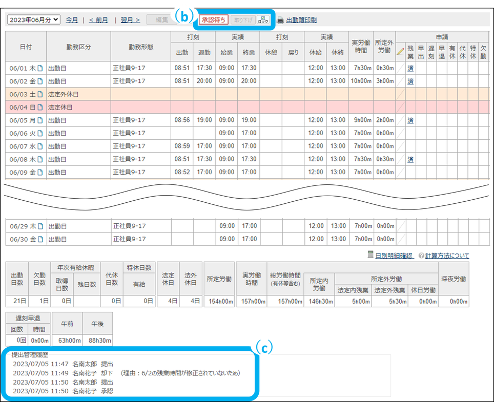 ※出勤簿提出時の制御を「許可する」の状態、かつ「承認待ち」の残業や有休等の申請がある状態で出勤簿を承認すると、「承認待ち」の申請はすべて「承認済み」になります。