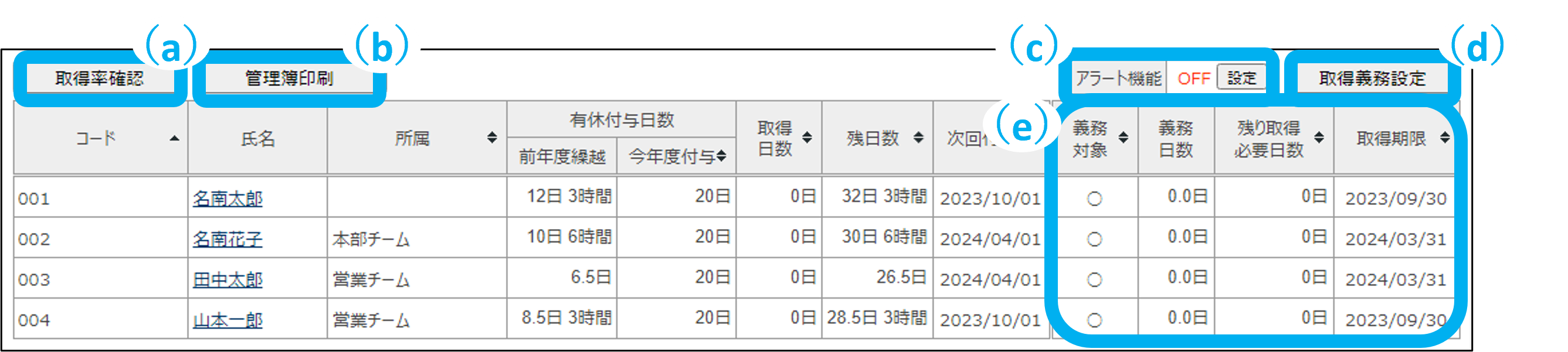 職員ごとに有休取得率を確認できます。