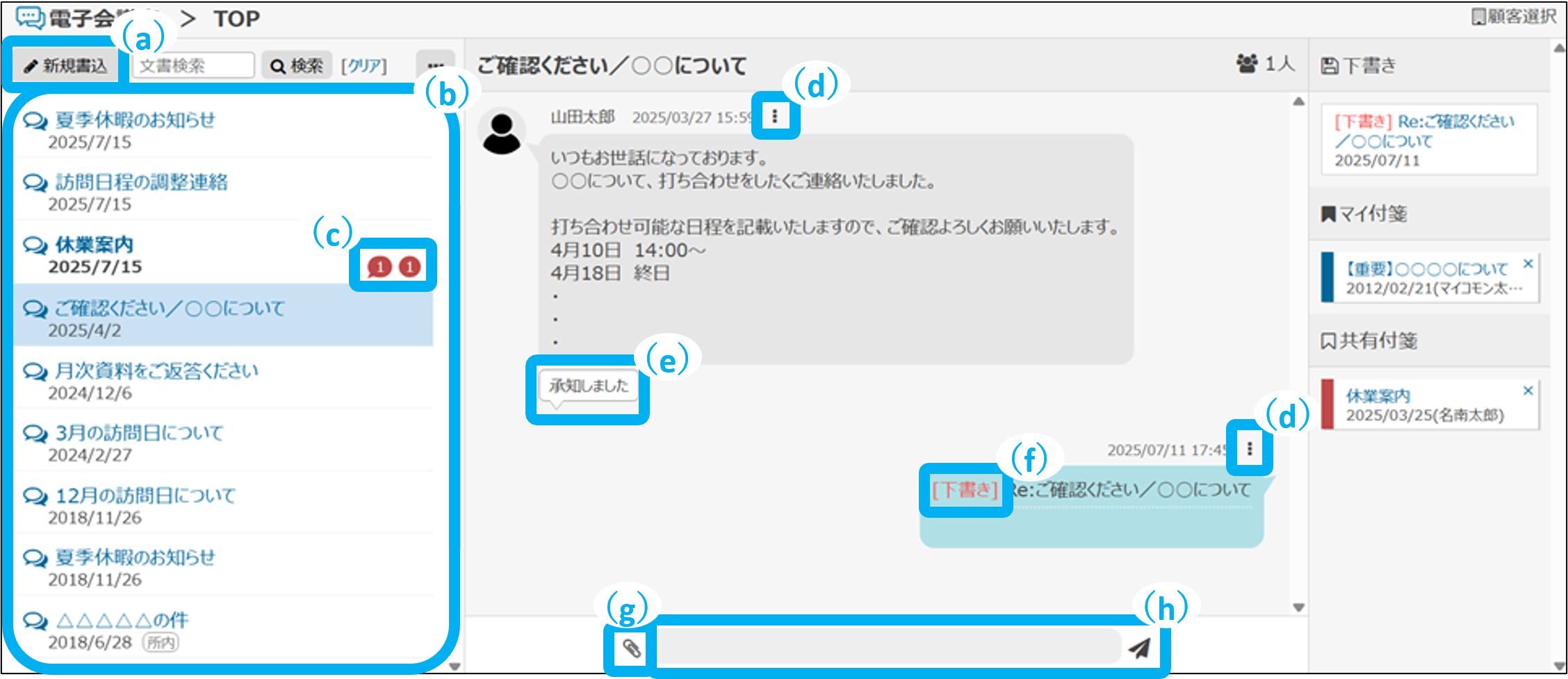 親文書と返信を吹き出しで表示できます。