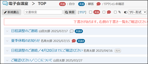 チャット形式から返答を書き込んだ場合、タイトルは「Re:親文書タイトル」となります。
