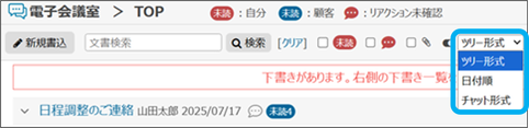 ツリー形式、日付順、チャット形式の3つから表示形式を選択できます。