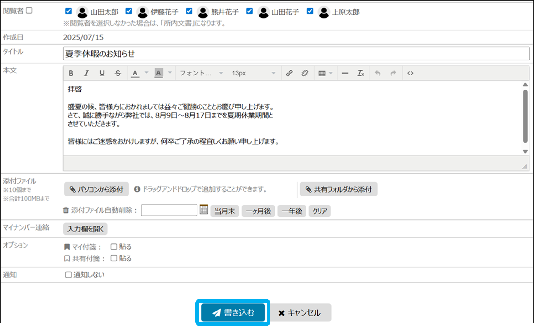 ※閲覧者を選択せずに書き込んだ場合、所内文書になります。