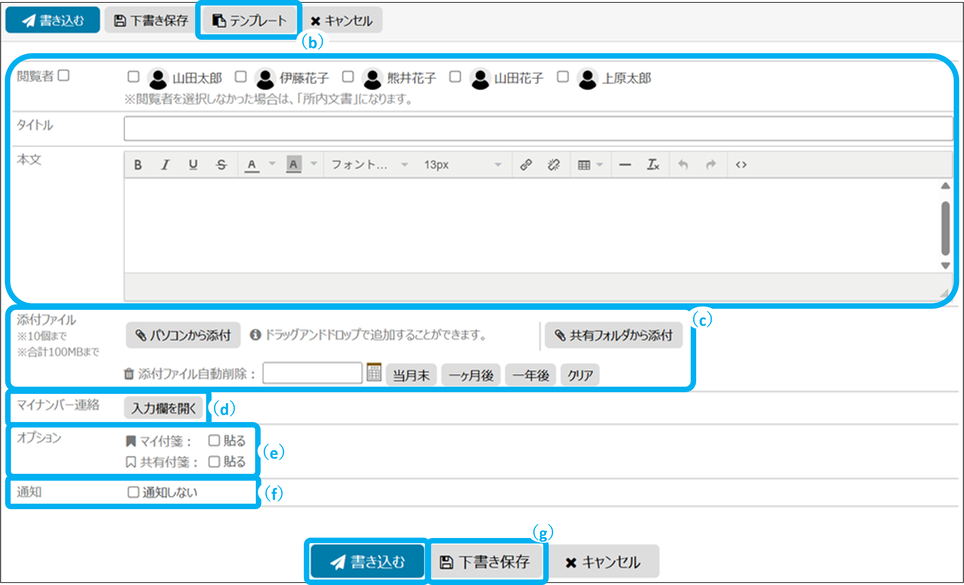 ※マイナンバー連絡、マイ付箋、共有付箋は下書き保存できません。